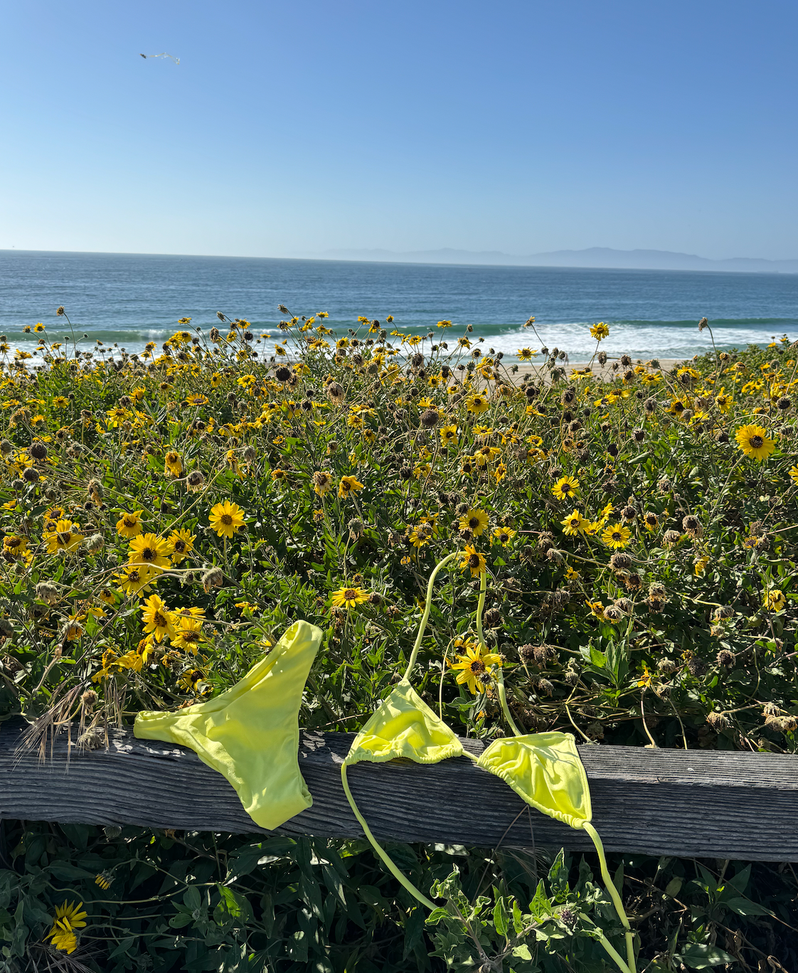 The Sunbeam Triangle Top is a classic with a radiant twist. Designed in a timeless triangle silhouette with adjustable straps for the perfect fit, this bikini top shines in a bold, bright yellow shimmer fabric. Made in Brasil, it’s lightweight, flattering, and made to stand out under the sun.
